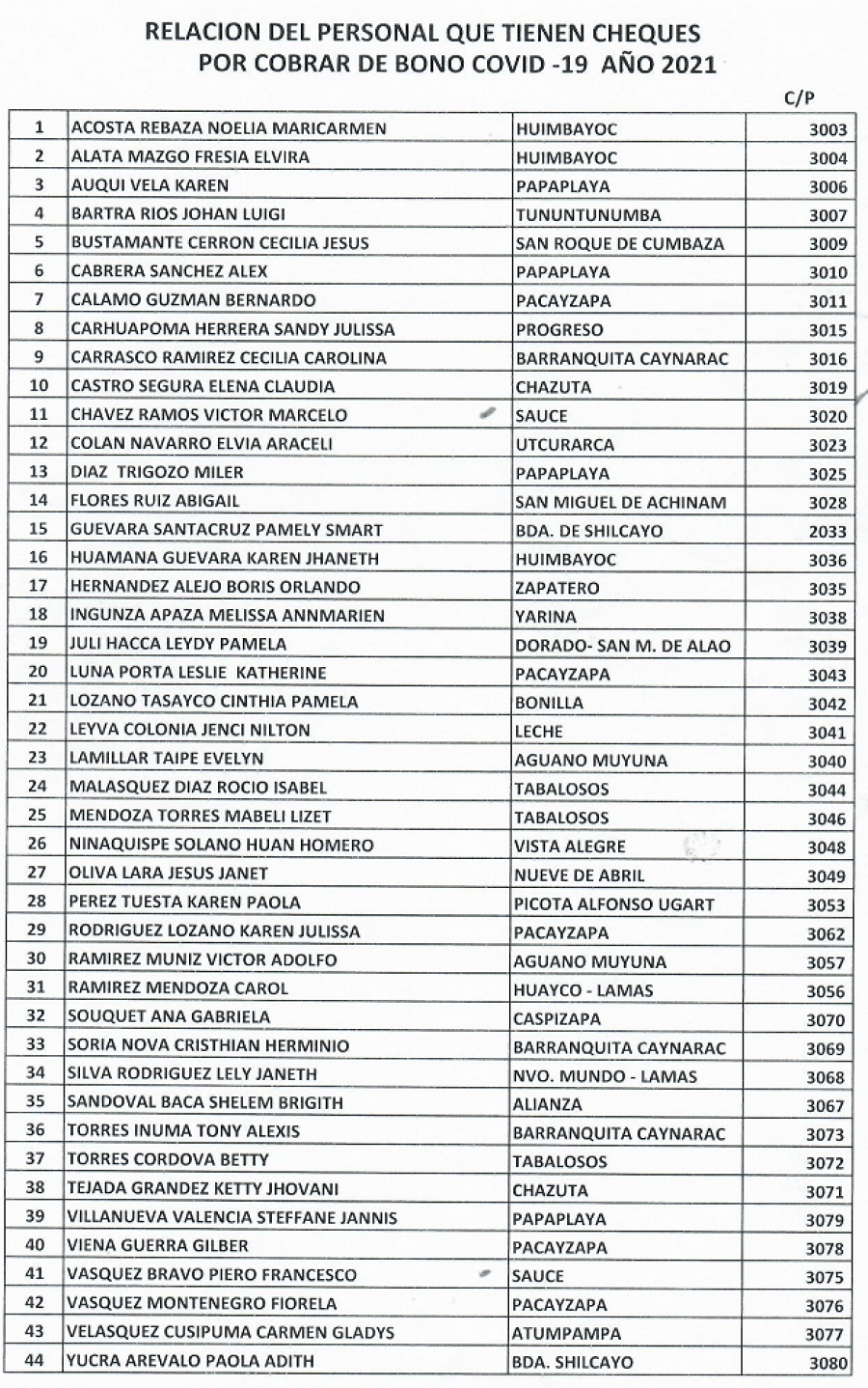 RELACIÓN DEL PERSONAL QUE TIENEN CHEQUES POR COBRAR DE BONO COVID19 AÑO 2021